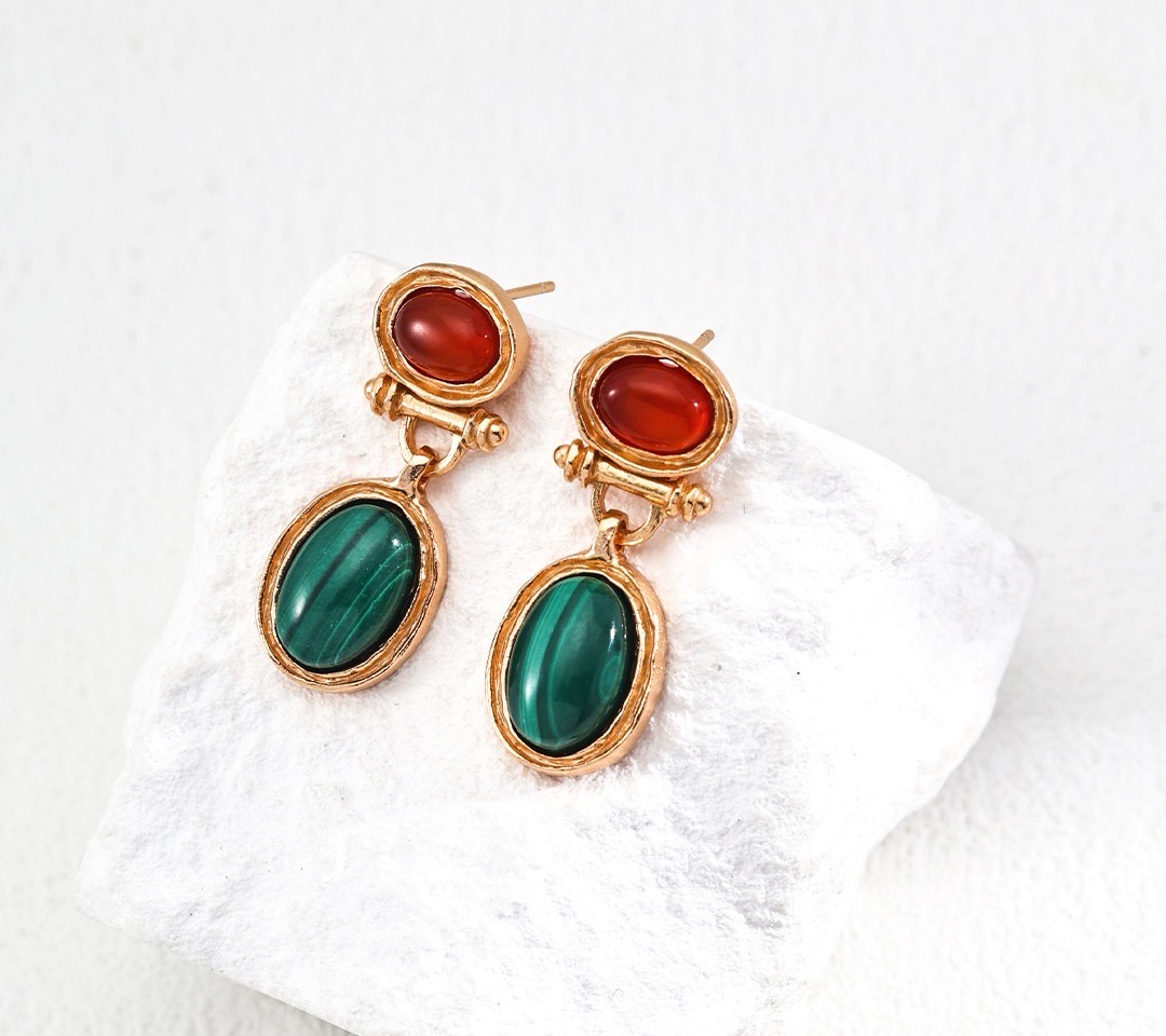 這款耳環以手工雕刻的肌理復古寶石為特色,紅瑪瑙熱烈如火,孔雀石則深邃迷人,色彩鮮豔且富有層次感,相互映襯,形成獨特的美感。復古撞色設計讓紅瑪瑙與孔雀石巧妙搭配,展現無與倫比的優雅與時尚。