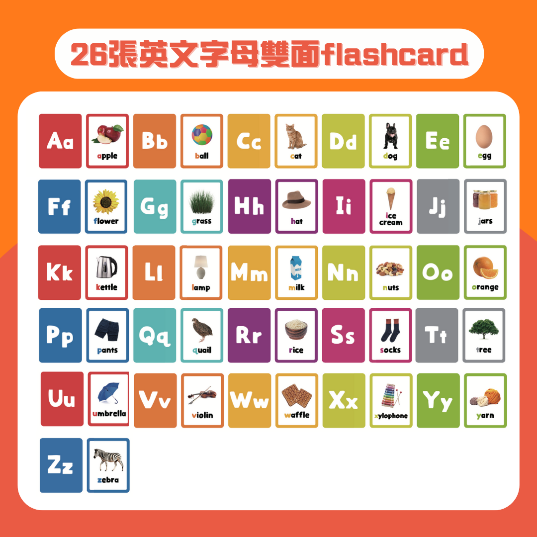 ✅內含26張英文雙面大卡flashcard,前面係ABC大小階字母,背面係英文字母開頭的單字及實物圖