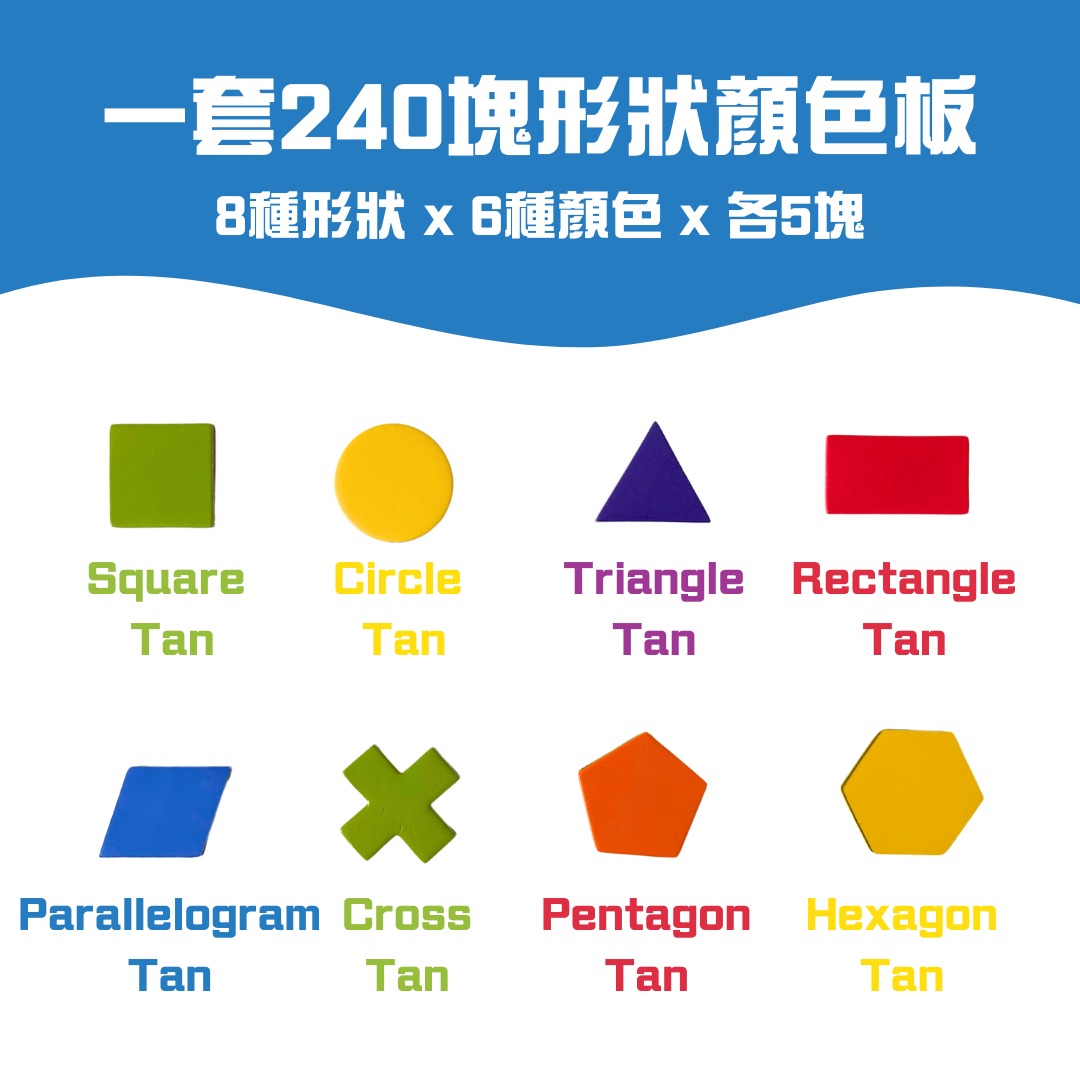 一盒Creative Tans一套有240片形狀板🟡🔺🟨,分別有正方形✅長方形✅三角形✅圓形✅五邊形✅六邊形✅平行四邊形✅交叉,各6種顏色(紅橙黃綠藍紫色),每款共30塊。