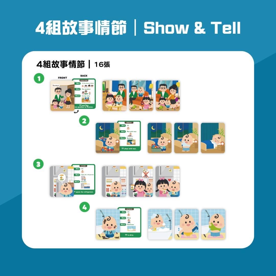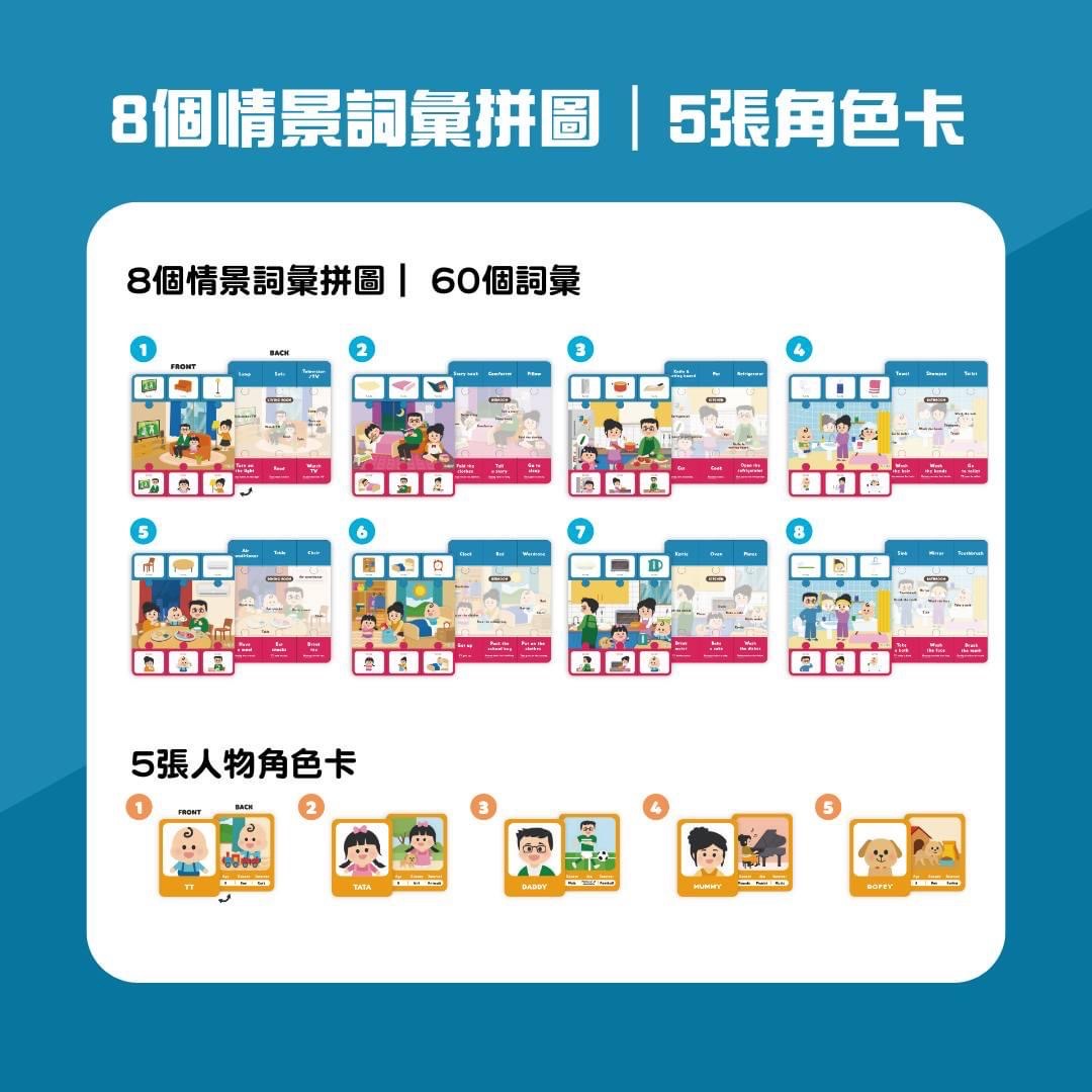 8個日常生活家庭場景入手,學習60+個生活實用詞彙,包括主語(人物角色)、動詞同埋名詞(日常生活物品),幫家長同小朋友代入平時生活情境製造語言環境,#聽說讀寫 唔好skip step,一定要多聽多講,再好好訓練show and tell嘅能力!