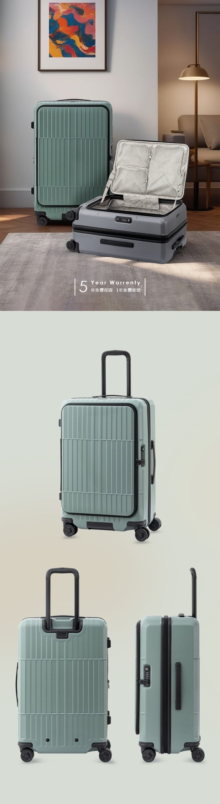 Departure the vista系列 29吋大容量前開式行李箱結合創新設計與卓越性能,採用前開式設計,方便隨時取用物品。後輪的煞車功能確保行李在任何情況下穩定不滑動,外殼100%使用德國拜耳(Bayer) PC材質,具備優異的耐衝擊性能。內部多層夾層搭配磁吸式扣環,輕鬆開合且不夾手,並設有USB充電孔,方便為電子設備充電。三段式人體工學鋁合金拉桿操作順暢,底部特殊凹槽手把增強搬運便利性,還配備美國海關認證的TSA密碼鎖,讓您的行李安全無虞,是您旅行的理想夥伴!
