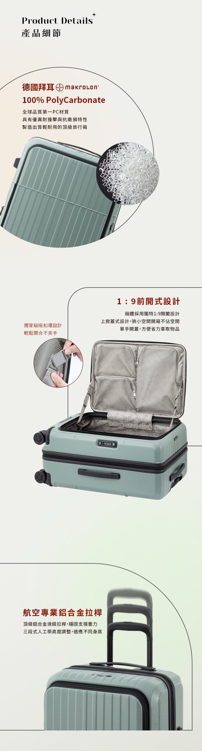 🛠️ 人體工學拉桿:三段式設計的鋁合金拉桿,符合人體工學,使用更為舒適。