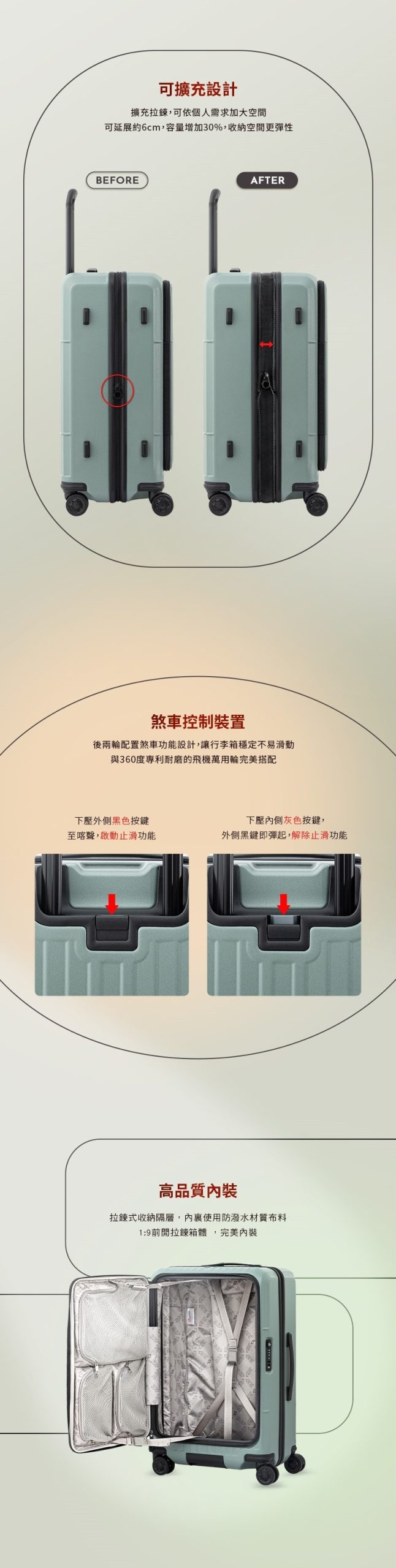 🚦 穩定煞車系統:後兩輪煞車功能,確保行李箱在任何情況下都穩定不滑動。