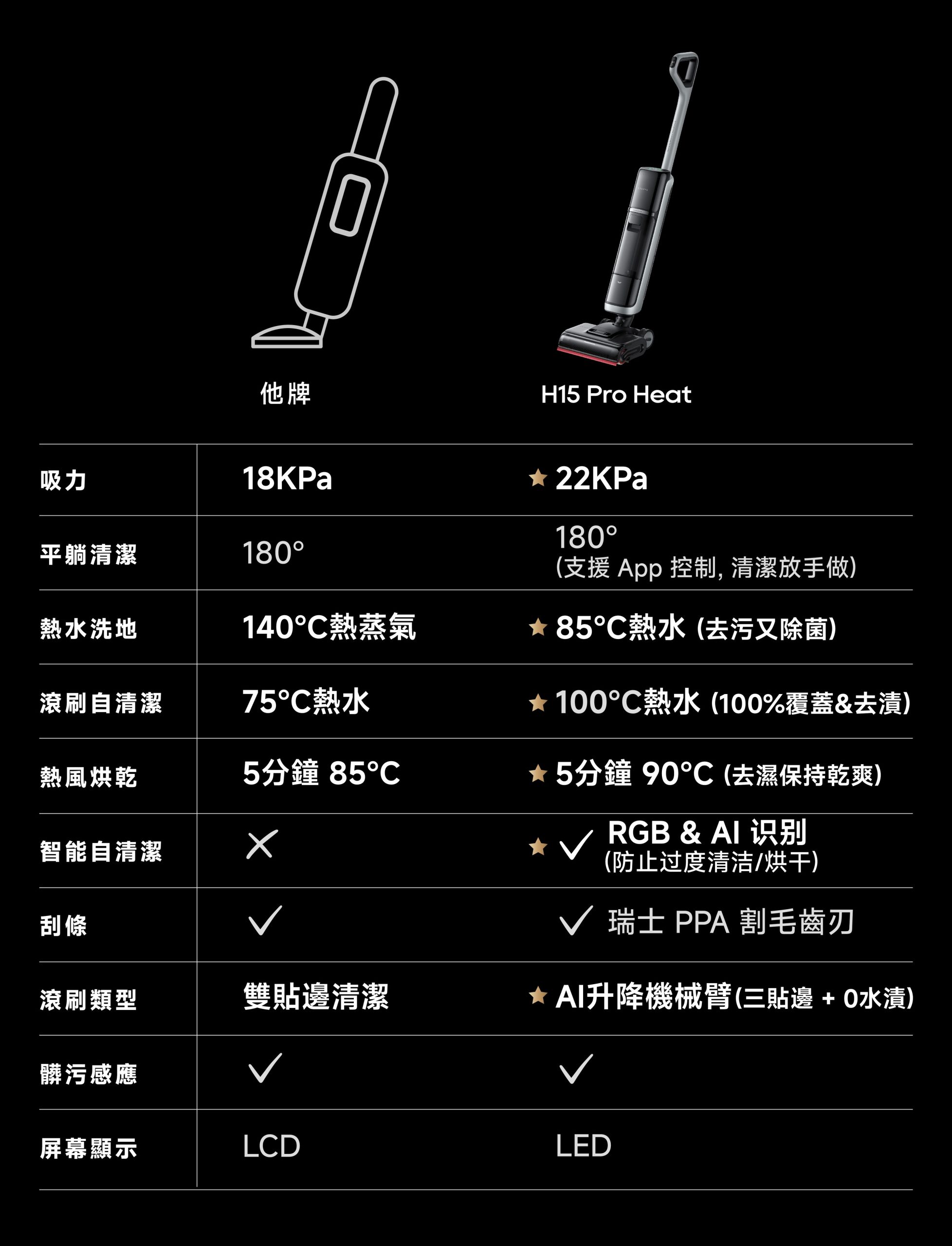 產品六大亮點: 🔥 22Kpa勁強吸力 🔥 防纏毛 PPA割毛齒刷 🔥 100°C 熱水自清潔 🔥 90°C 5分鐘極速烘乾 🔥 85°C 熱水洗地 🔥 升降機械手臂 三側貼邊