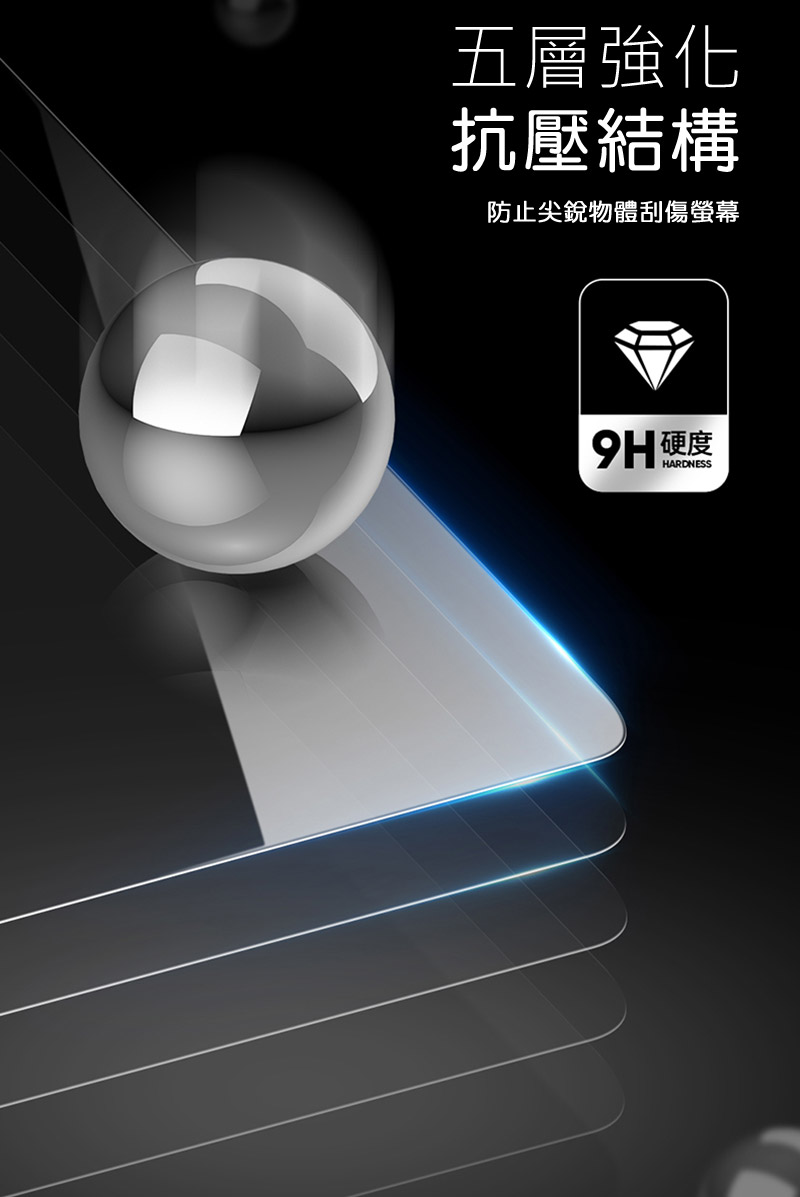 .五層強化,9H 硬度,抵擋尖銳物品劃傷螢幕