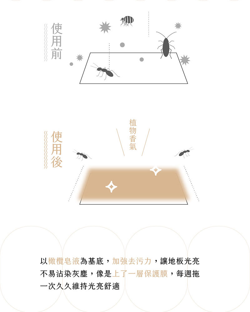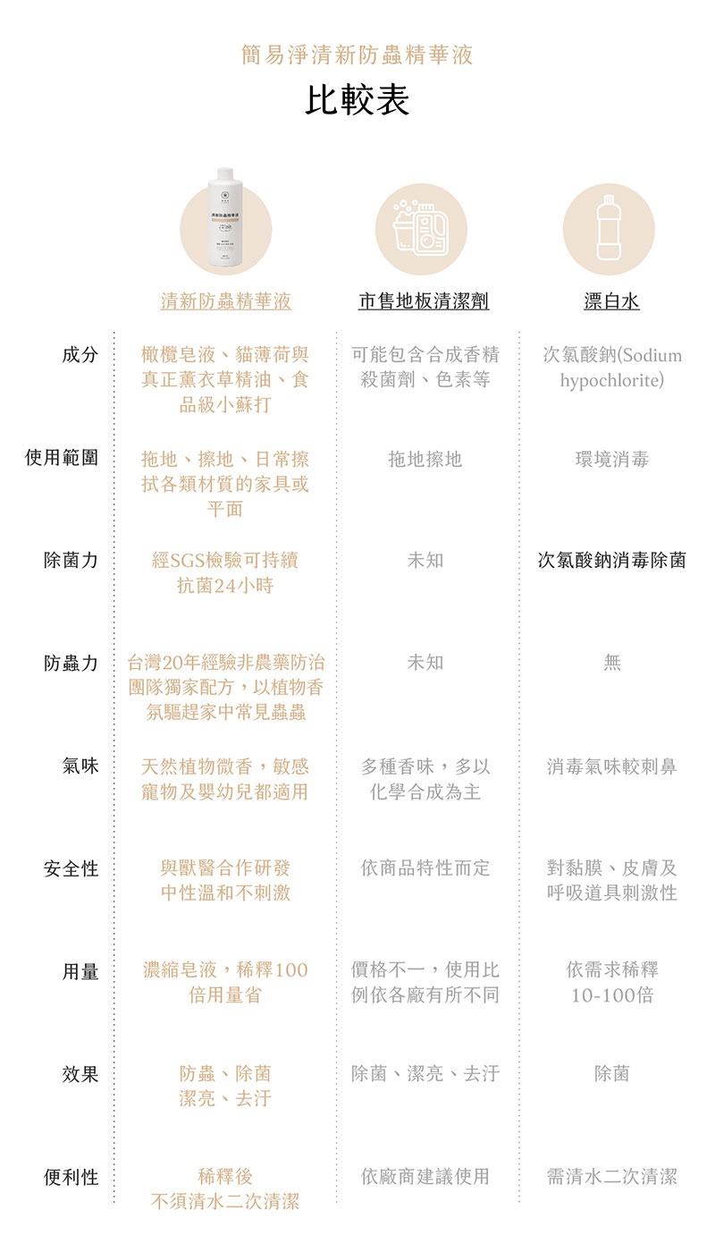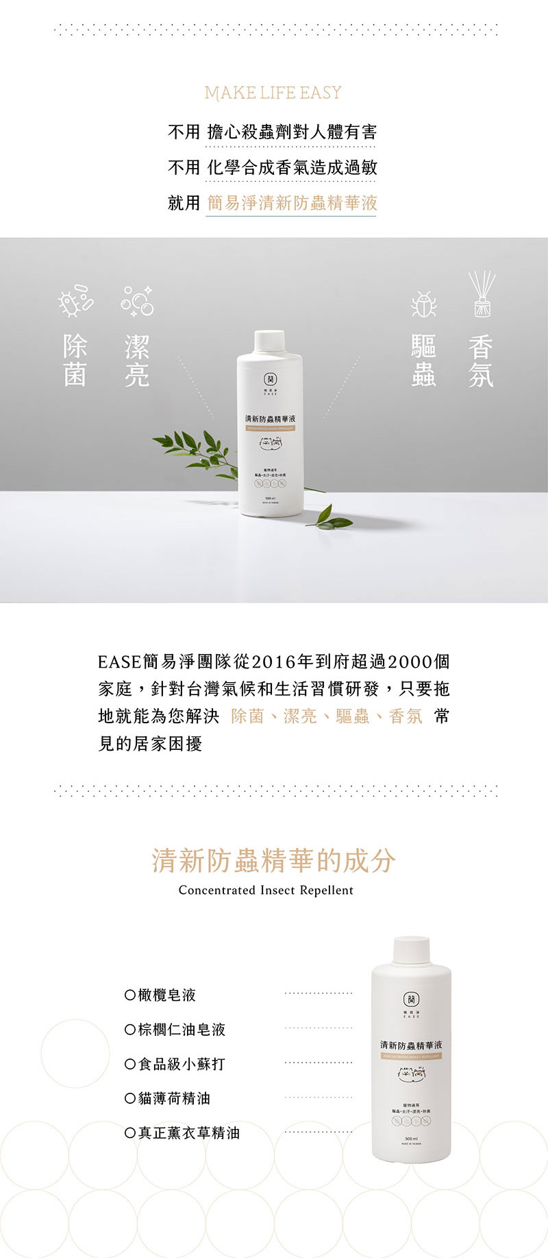 獨家台灣20年專業非農藥防治團隊研發,以貓薄荷(荊芥)為原料,讓植物的自然香氣營造害蟲討厭的環境,加上溫和的橄欖皂液加強清潔除臭,家有寵物也能安心使用。