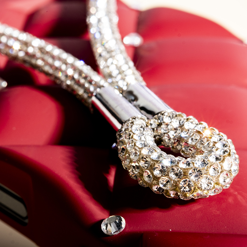撩動女人心弦:這款奢華的珠寶保護殼採用絎縫和水鑽設計。