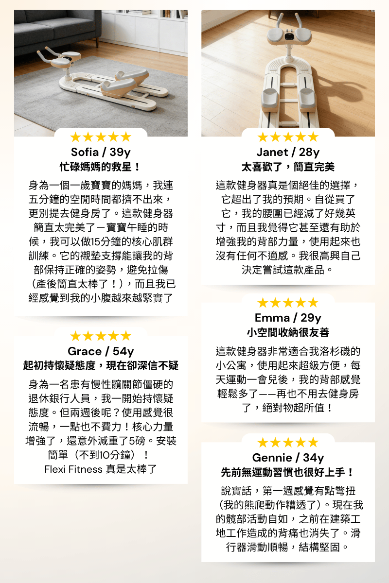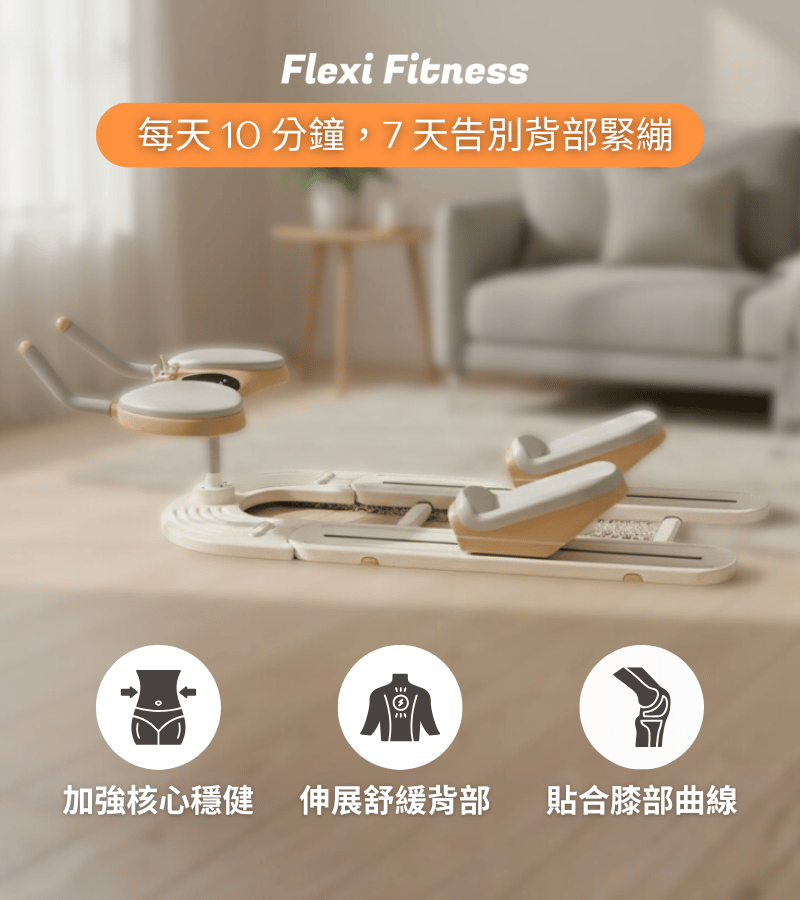 Flexi Fitness 透過簡單的雙腳滑動設計,結合身體扭轉與伸展動作,達到核心訓練和背部的放鬆;操作直覺、容易上手,讓居家訓練也能輕鬆養成規律習慣💪