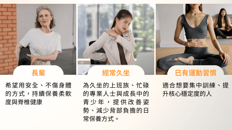 - 背部伸展與扭轉 → 釋放背部日常累積的緊繃與壓力