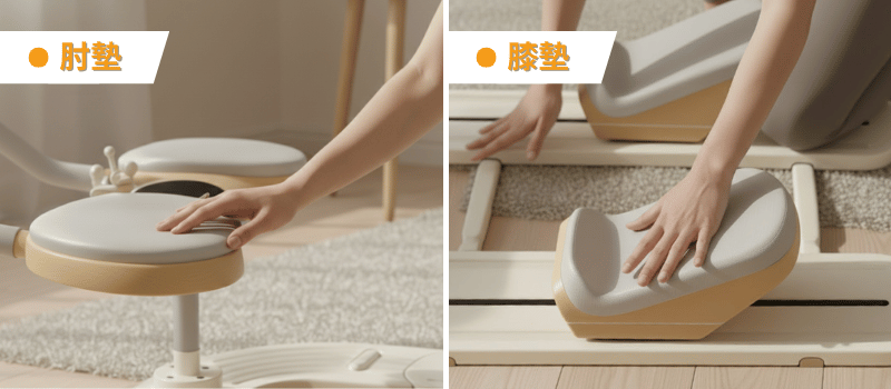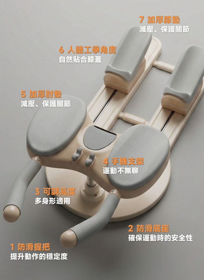 - 配件:止滑握把、加厚護膝墊、加厚護肘墊、金屬支撐架、防滑墊