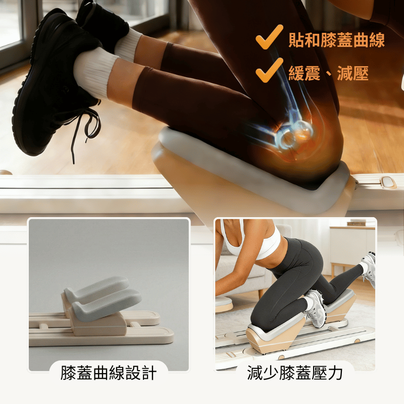 以人體工學為基礎設計,貼合膝蓋自然受力角度,讓動作進行時更穩定,有效降低對膝關節的壓力與負擔;
