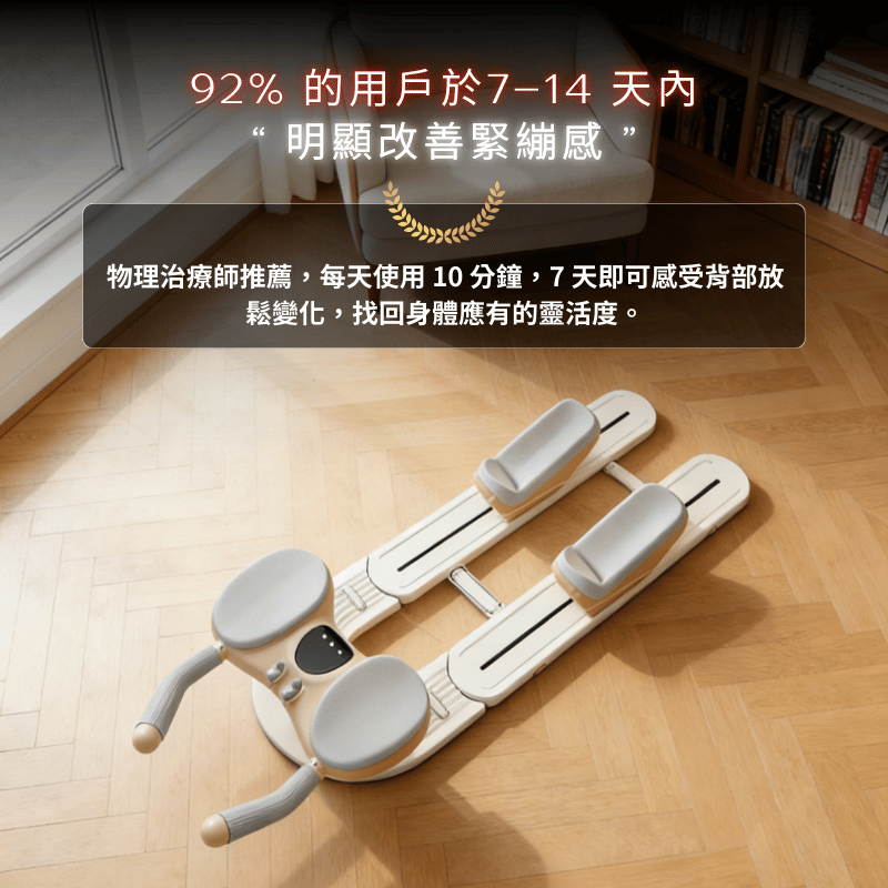 A: 這款產品以低衝擊設計為核心,扭轉幅度可自行控制,只要依照自身舒適範圍操作,就能在不勉強的情況下安全活動脊椎。
