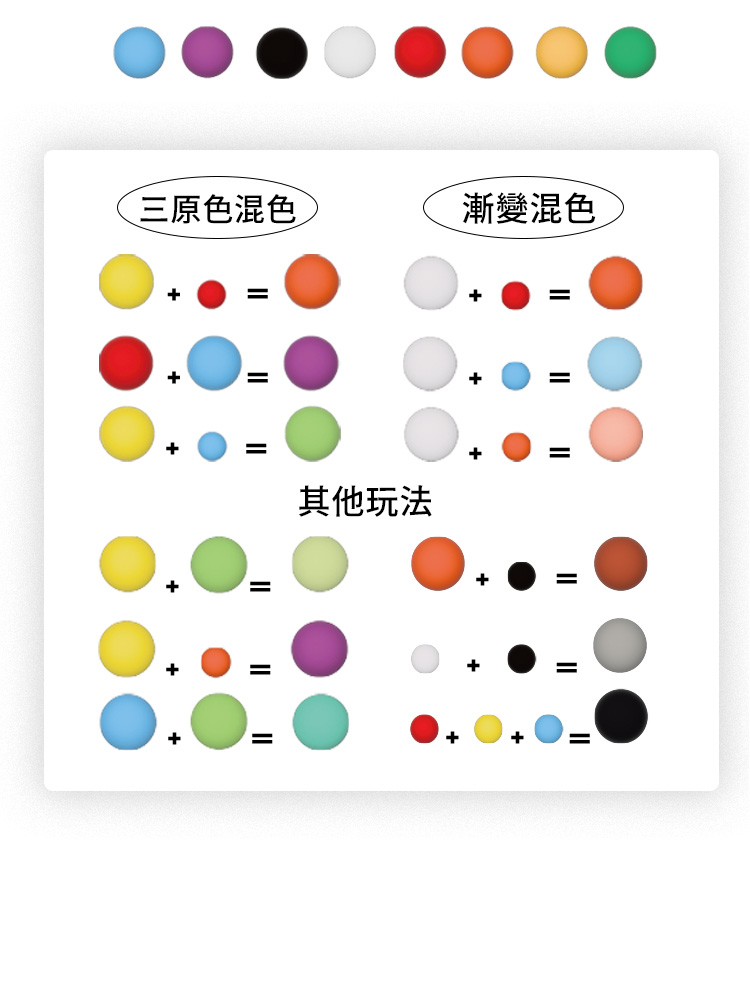 8色黏土、小袋獨立包裝,可混色變換更多色系