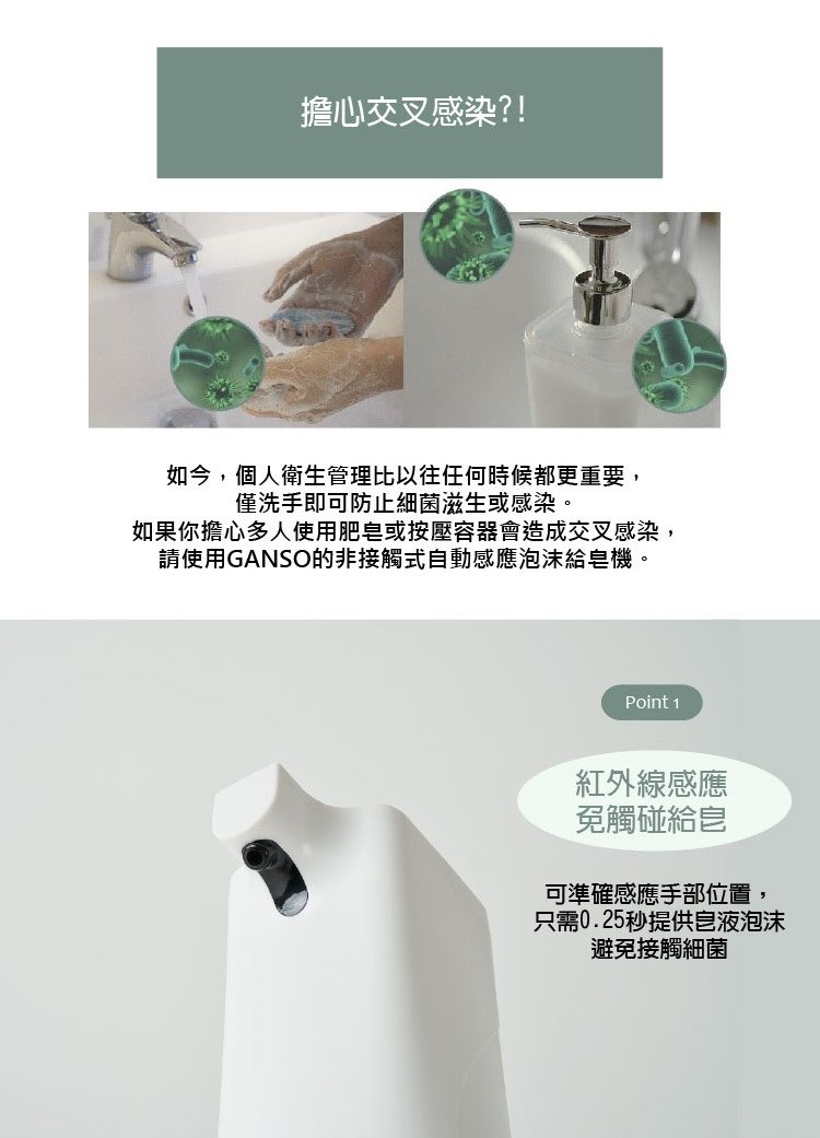 - 紅外線感應免觸碰給皂:可準確感應手部位置,只需0.25秒提供皂液泡沫避免接觸細菌。