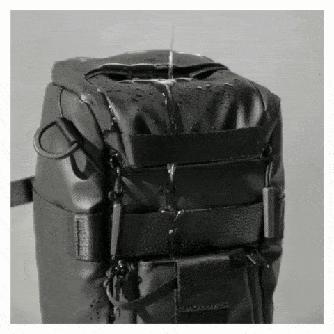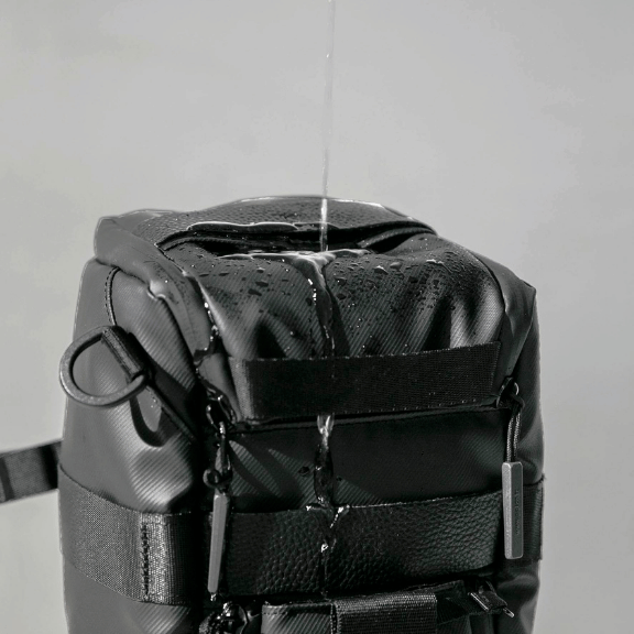 A:表面具防潑水處理,可應付小雨或毛毛雨,避免內容物被淋濕。但並非完全防水,長時間或大雨環境下,建議搭配防雨罩使用。