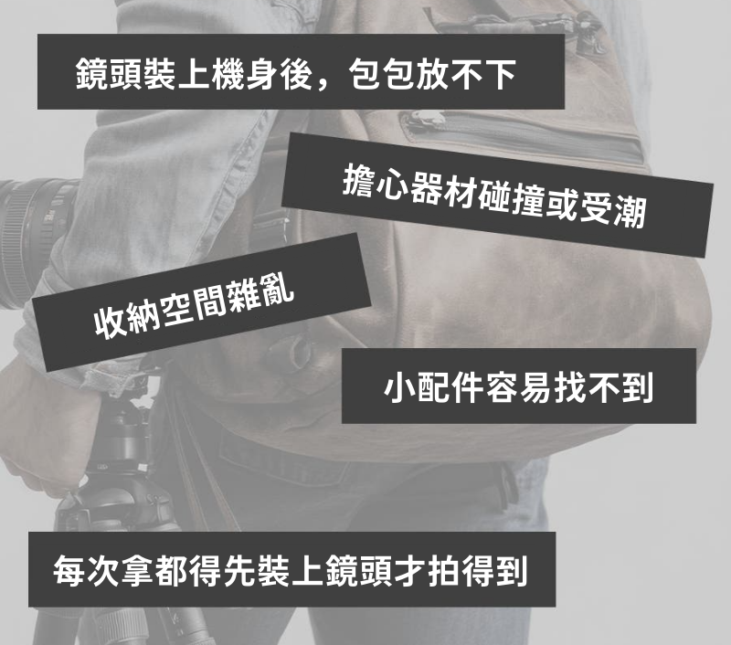 - 包2:鏡頭盒與配件收納,讓小物與鏡頭安全分隔,不再凌亂。