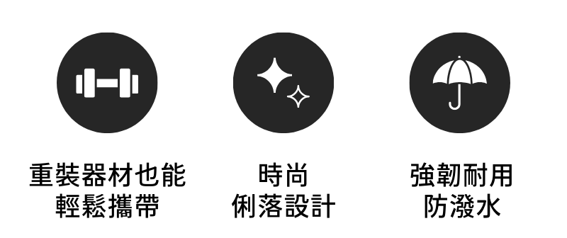 A:主要材質為防潑水耐磨的聚酯纖維與尼龍,受力區域則搭配人造樹脂與牛皮,加上嚴選用料,足以應付長時間與戶外使用。