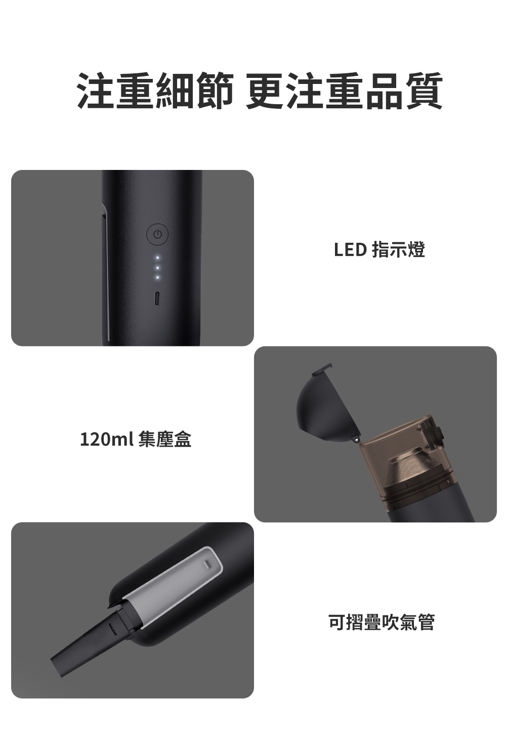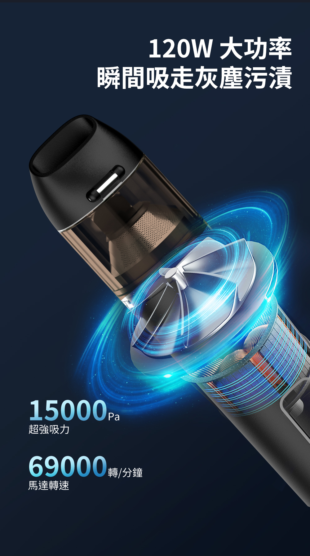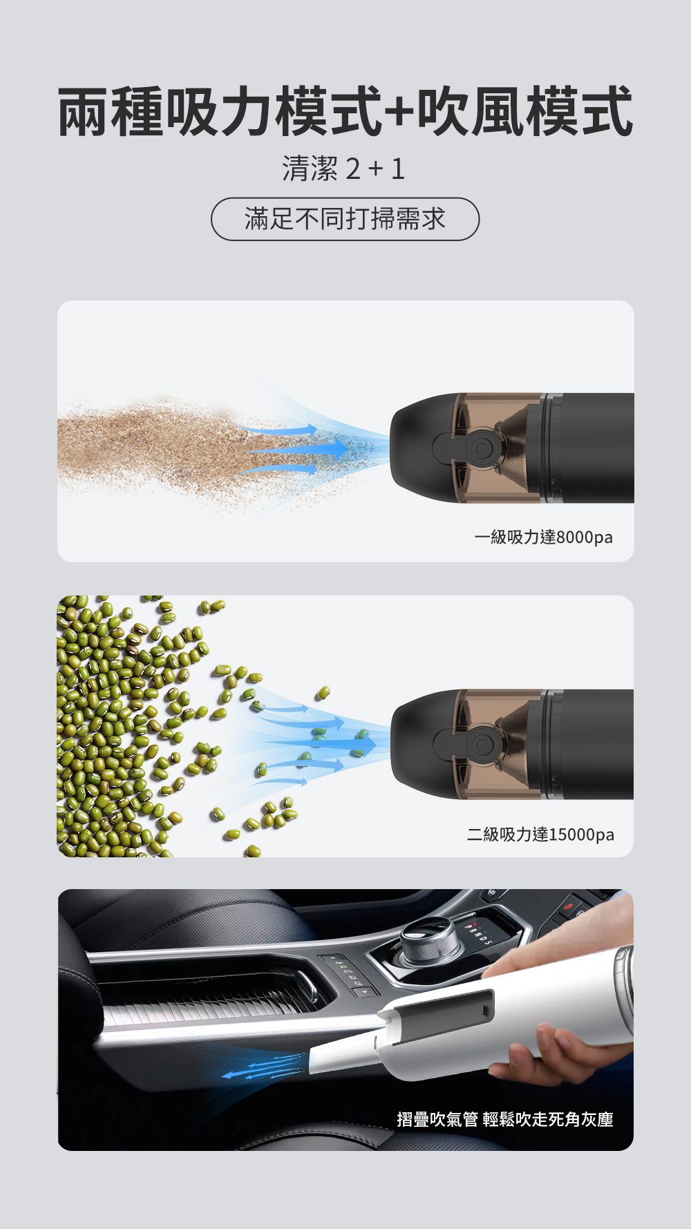 最新吸吹功能二合一,適合不同環境使用;兩檔吸力模式:一級吸力達 8000pa,二級吸力達15000pa,超强吸力,瞬間吸走灰塵污漬;內置4組2000mAh動力電池,超長使用時間,充滿電可使用長達40分鐘(一級)或15分鐘(二級)。