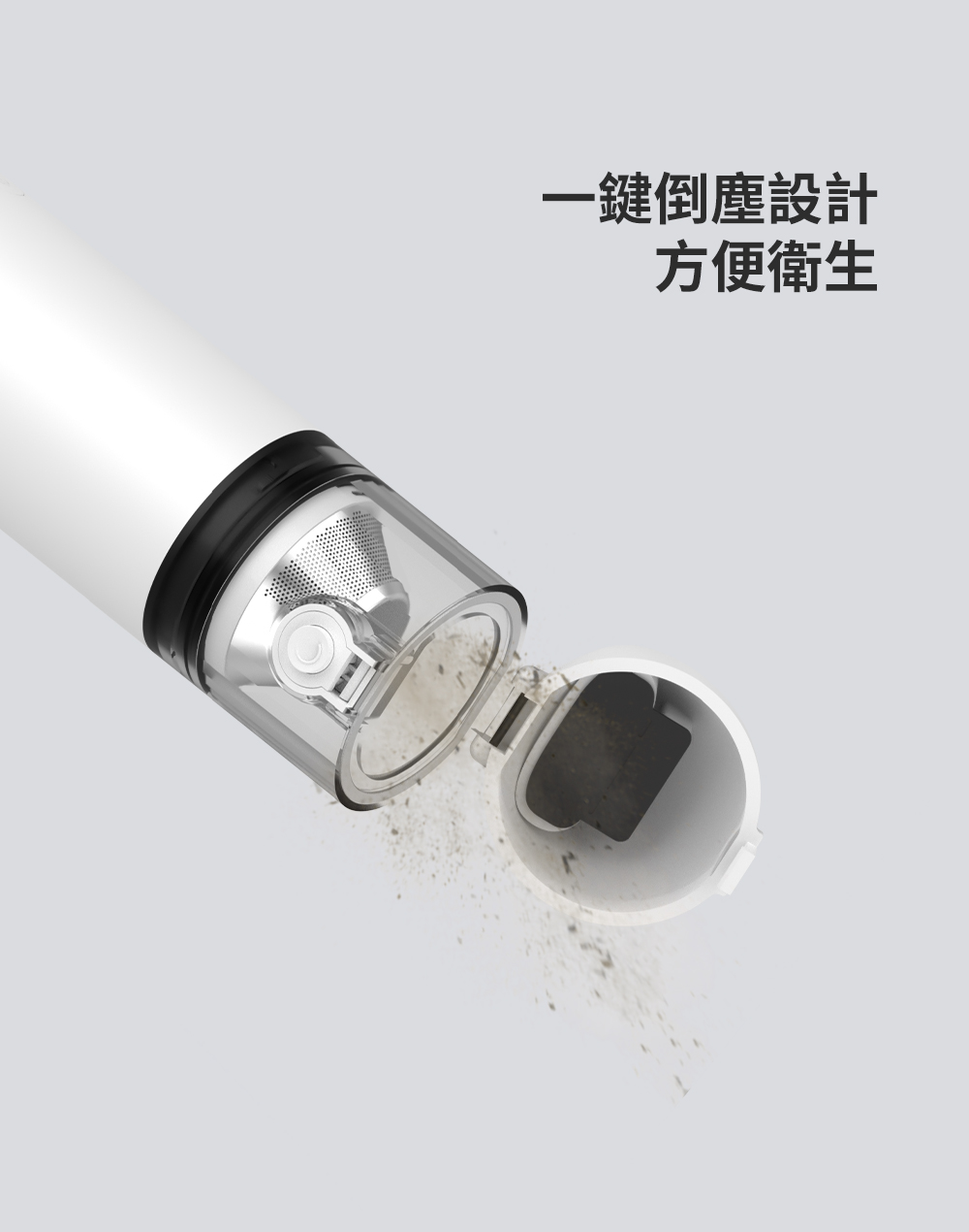 58mm直徑細小機身,輕鬆收納使用;可視集塵盒加一鍵倒塵設計,方便又衛生;不銹鋼濾網加環保可水洗濾芯,雙重過濾、無懼細小塵粒;附送延長吸頭及毛刷頭配件,針對不同細小罅隙,深入清潔無死角;適合小面積打掃,如家居、辦公室和汽車等。