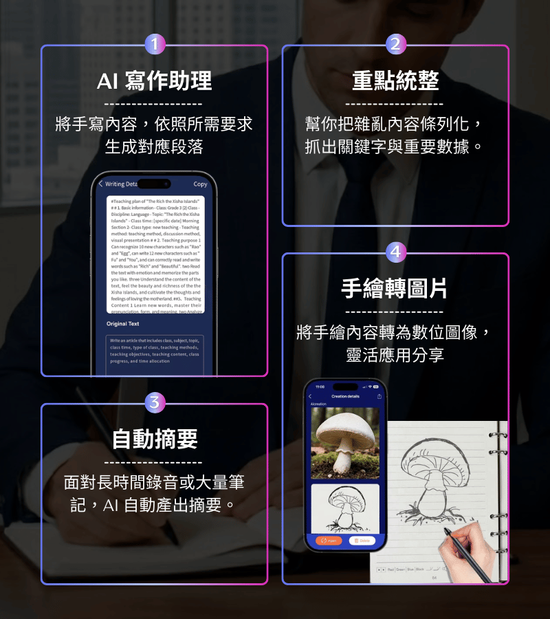 A: 包含自動摘要、重點整理、智慧識別筆跡、將手繪內容轉位數為圖像等,讓大量筆記更易於管理與回顧。