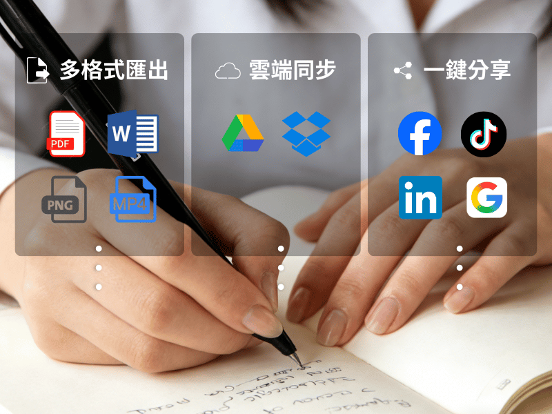 • 將筆記匯出為 PDF、Word、PNG 或 MP4 等常用格式