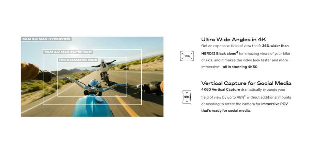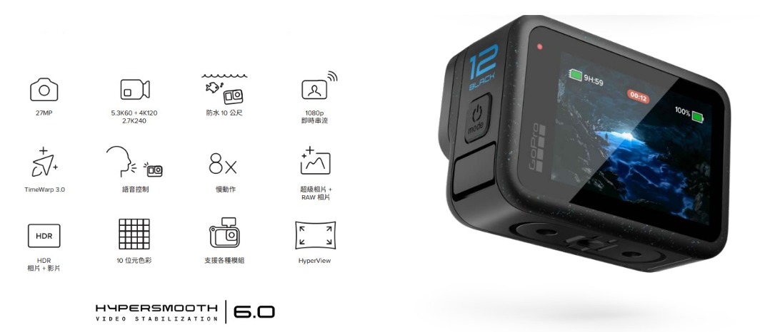 HERO12 Black 結合卓越的影像品質與 HyperSmooth 影像穩定功能,並大幅強化電池續航力,能拍攝同級最佳的 5.3K 影片。具備高動態範圍成像(HDR)功能,捕捉更多細節,記錄人生難得的旅程與日常精彩瞬間。