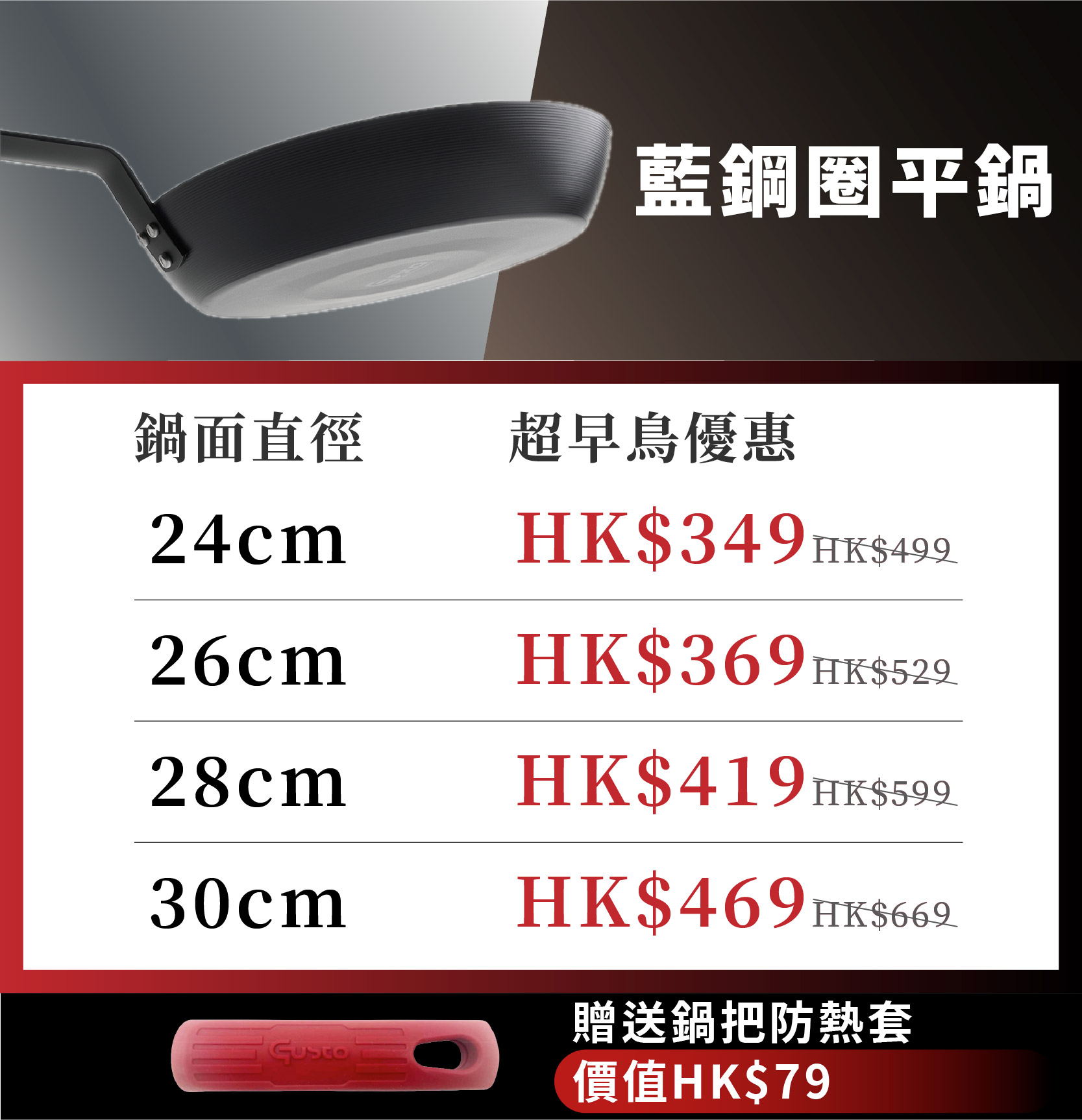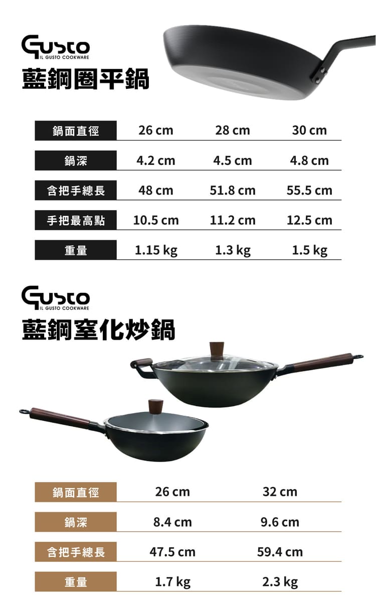 GUSTO 藍鋼鍋新系列一共推出平底鍋、炒鍋兩類型以及多種尺寸,料理需求全達成!