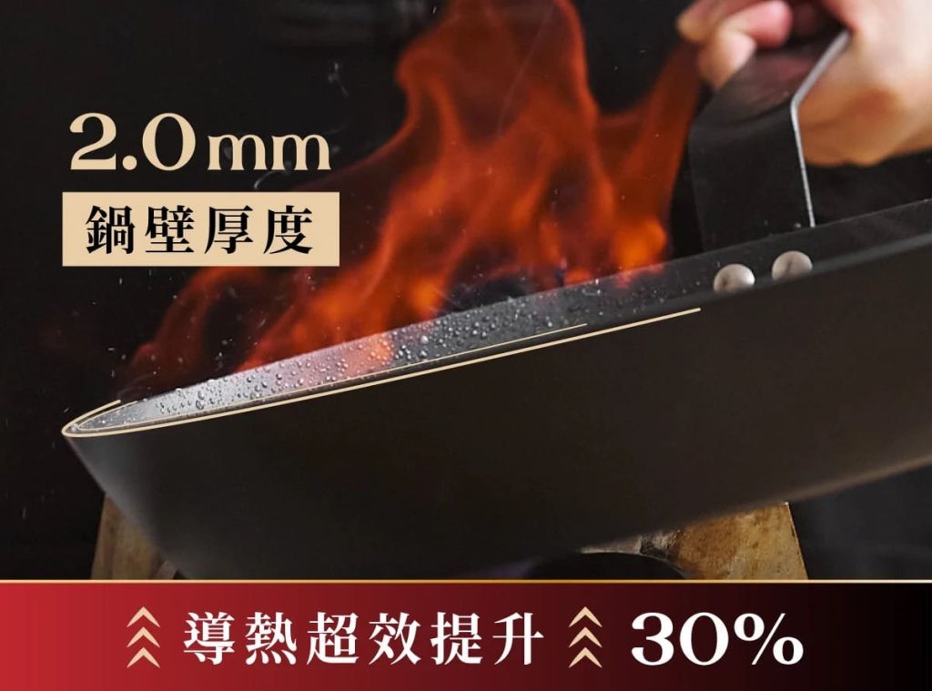 A:GUSTO 3.0 藍鋼料理鍋系列,鍋身厚達 2.0 mm ,超效導熱率躍升高達 30%,疾速聚熱,鮮甜滋味完整封存!同時炒煎出你最愛的恰恰焦香鍋氣。