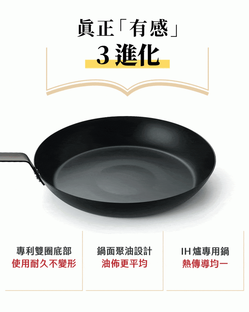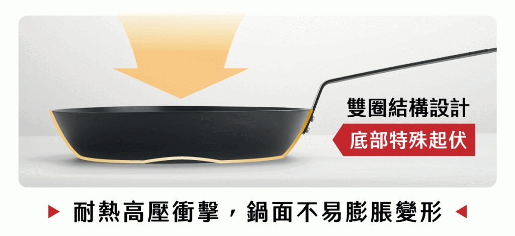 將油倒入自動集中,不必費力搖鍋,油佈完美均一。破千回饋最困擾的 IH 爐易使鍋子變形同步解決!特殊工法雙圈壓製,一次做到三大保證,輕易煎炒爆香氣、避免食材易燒焦,鍋子耐煮不變形!