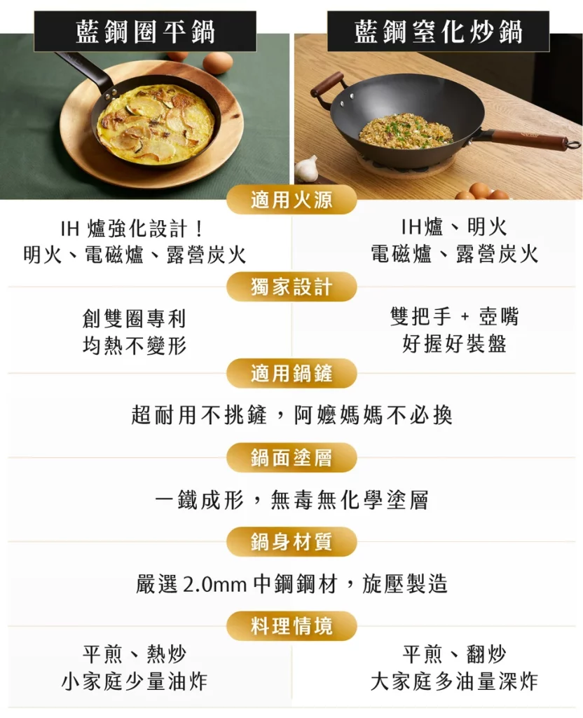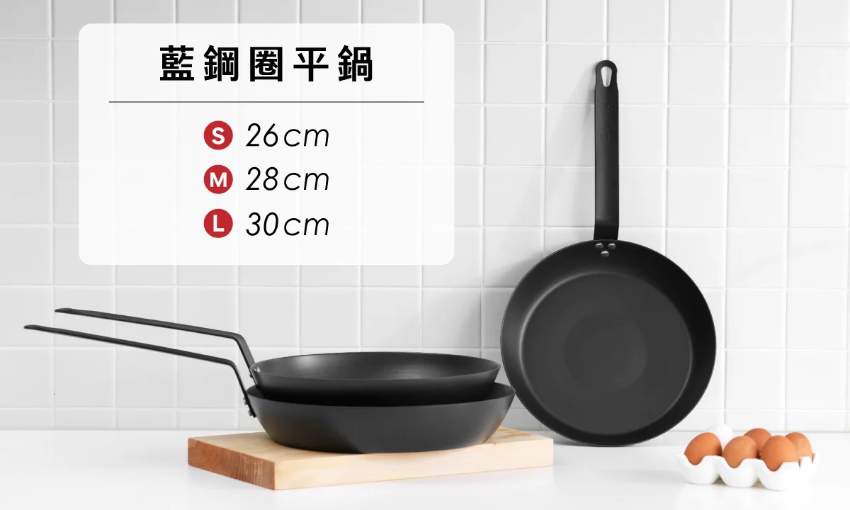 藍鋼平底鍋 20cm, 藍鋼圈平鍋 26cm, 藍鋼圈平鍋 28cm, 藍鋼圈平鍋 30cm, 藍鋼窒化炒鍋 26cm, 藍鋼窒化炒鍋 32cm