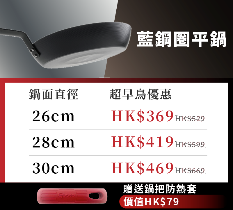 歐美知名品牌鍋具指定代工已超過三代的 GUSTO,堅持首選台灣中鋼碳鋼 × 50 年製鍋經驗 ,打造好評破表藍鋼平煎鍋!