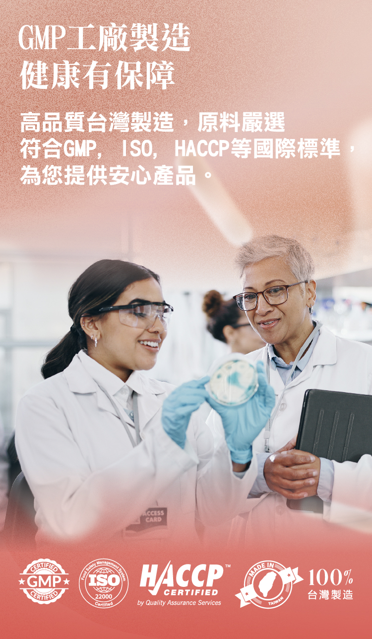 100%台灣製造 🇹🇼 | 通過GMP、ISO、HACCP國際認證 🏅