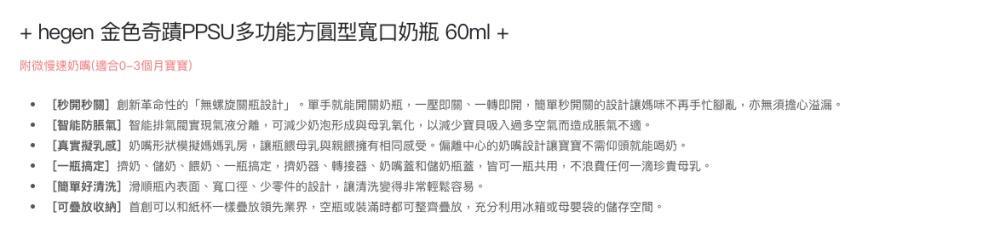 1 x hegen 金色奇蹟PPSU多功能方圓型寬口奶瓶 60ml (象牙白)