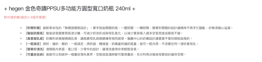 1 x hegen 金色奇蹟PPSU多功能方圓型寬口奶瓶 240ml (象牙白)