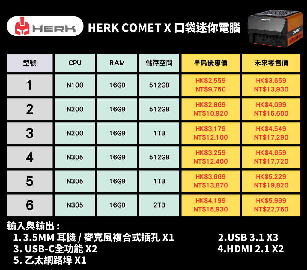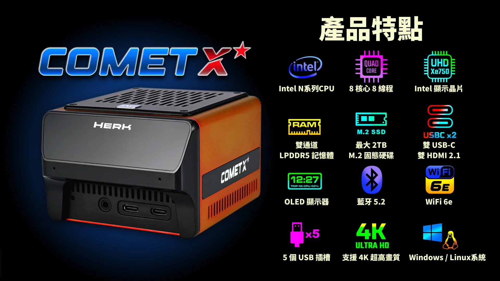 - 首款內建 OLED 顯示螢幕的微型電腦:Comet X 配備豐富的 I/O 接口,包括 7 個 USB 插槽、雙 HDMI 插槽、乙太網接口和雙麥克風,是市面上少見的高擴展性微型電腦!