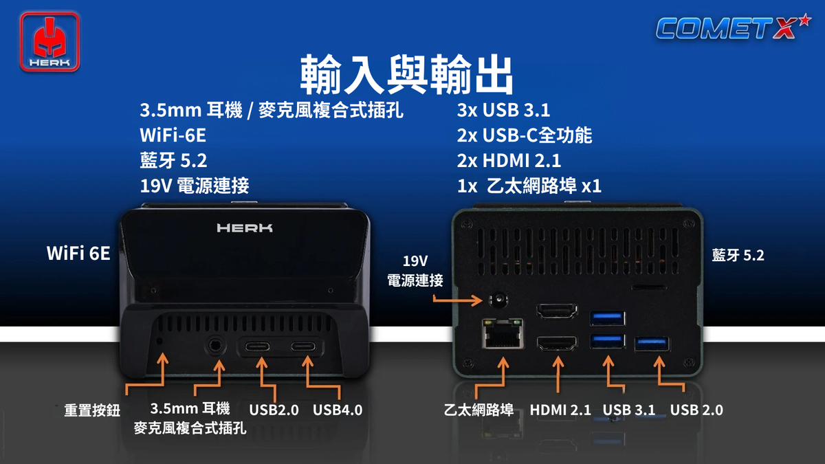 為了提升工作效率,多元且便捷的連接方式是不可或缺的。Herk Comet X 配備了後方圓形電源插座與6個I/O接口,前方則設有3個接口,讓設備連接更快速順手。