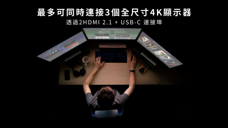 Herk Comet X 配備後置雙 HDMI 2.1 接口,每個接口的帶寬高達 48Gbps,比 HDMI 2.0 高出 30Gbps,可支援兩台 4K 螢幕。另外,前方還有一個 USB-C DisplayPort,可輸出高達 8K 的影音,實現三螢幕的完整使用體驗。