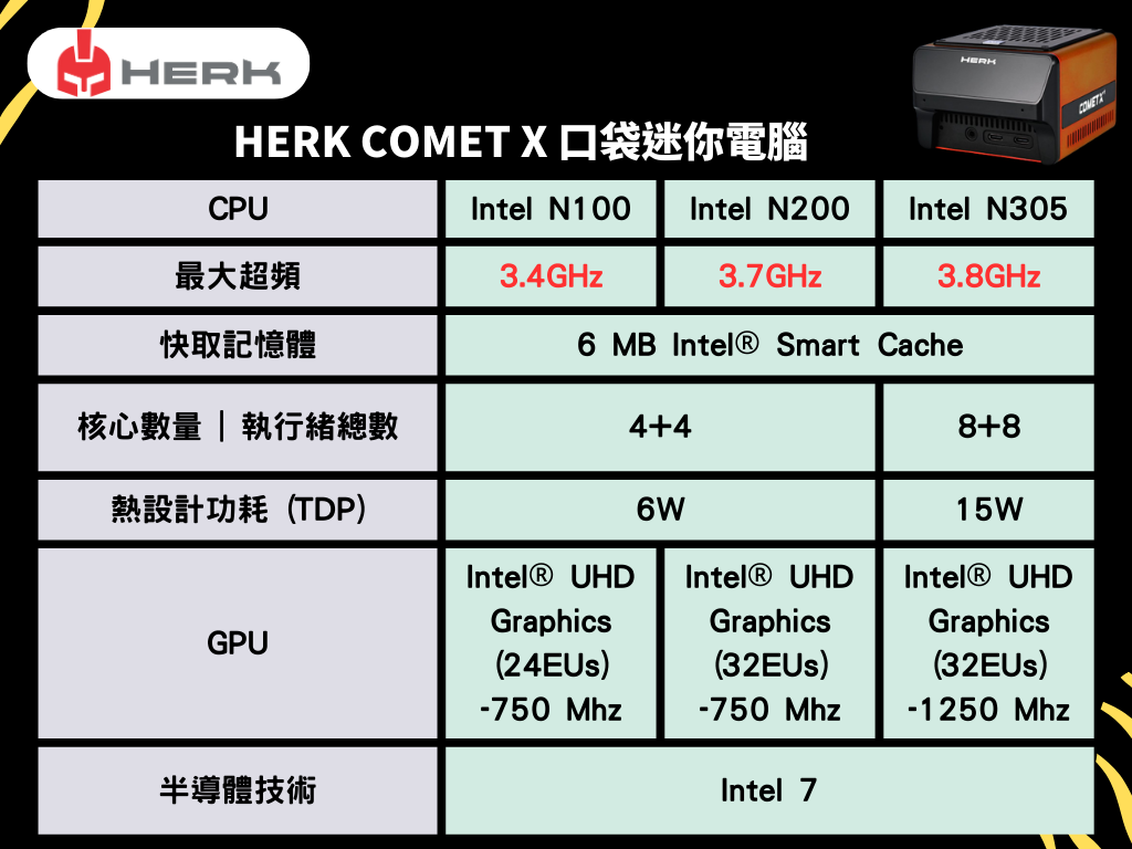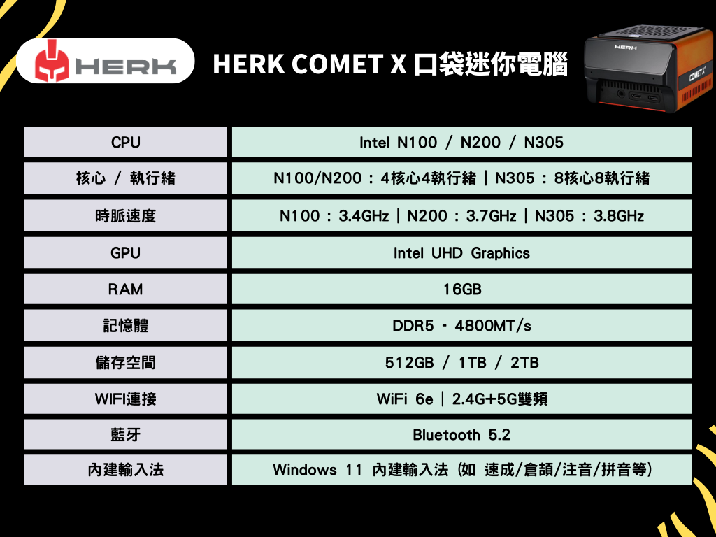 A:Herk Comet X具有微小的外形,加上強大的IO埠7usb,乙太網,3個顯示器功能,麥克風/耳機插孔,OLED顯示屏,更高的記憶體容量選項,模組化設計等…… 投入許多設計和工程到Herk Comet X。