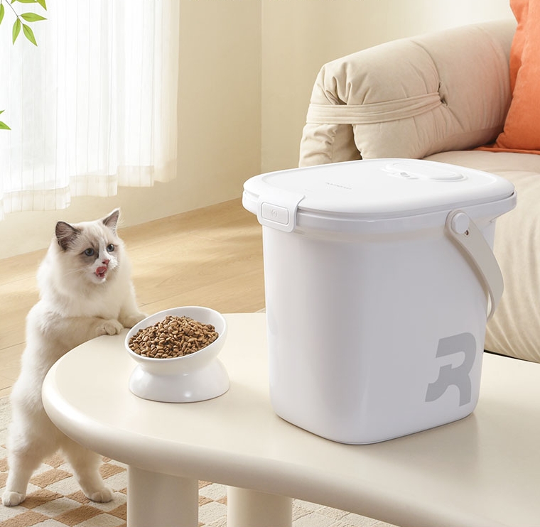 2. 安全便捷:內置物理彈簧,關蓋防夾手;一體式翻蓋設計,單手取糧輕鬆便捷;標配磁吸餐勺,方便收納。