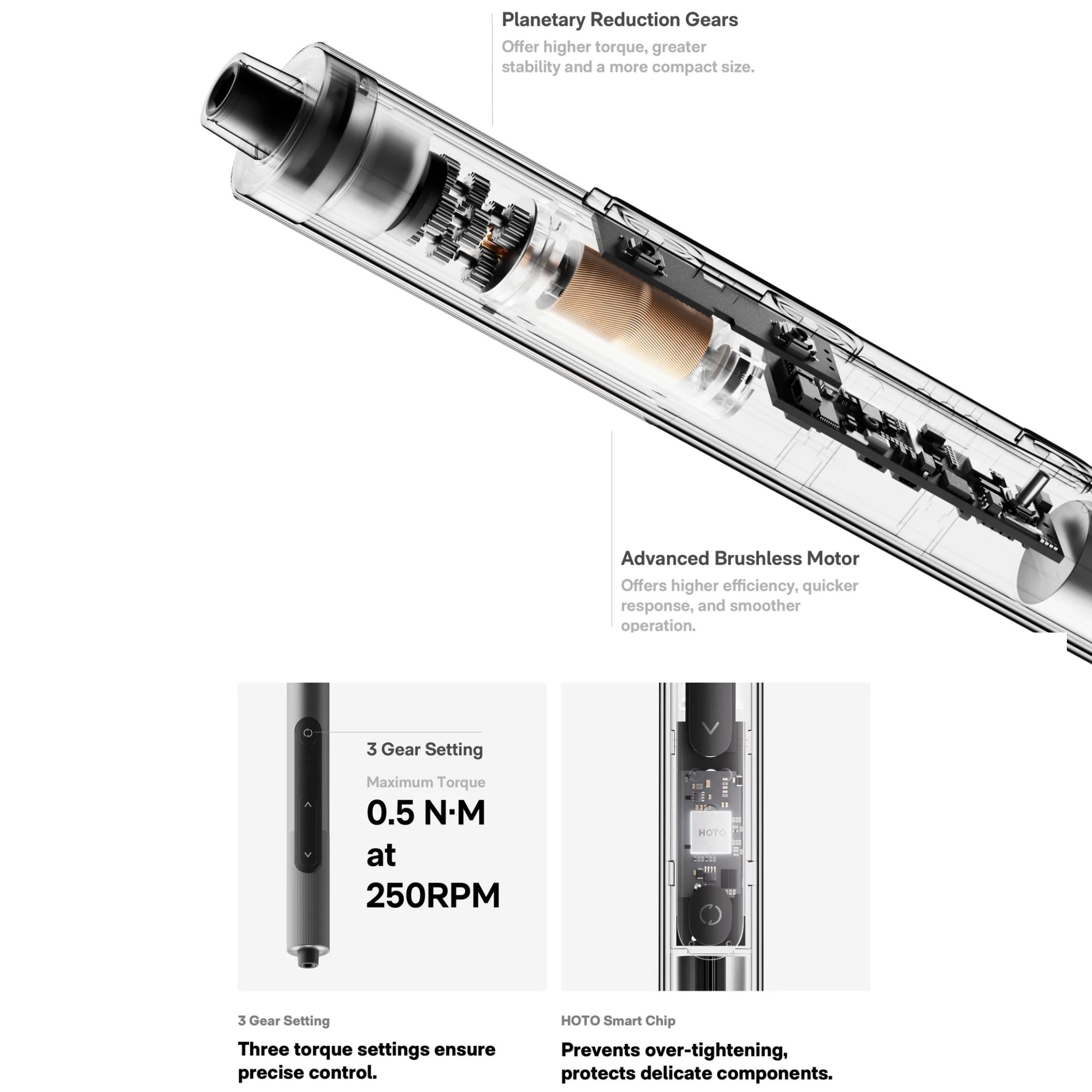 *無刷馬達技術*:率先在精密工具中使用無刷馬達;提升穩定性、效率更高、運作更安靜、性能一致且工具壽命延長。