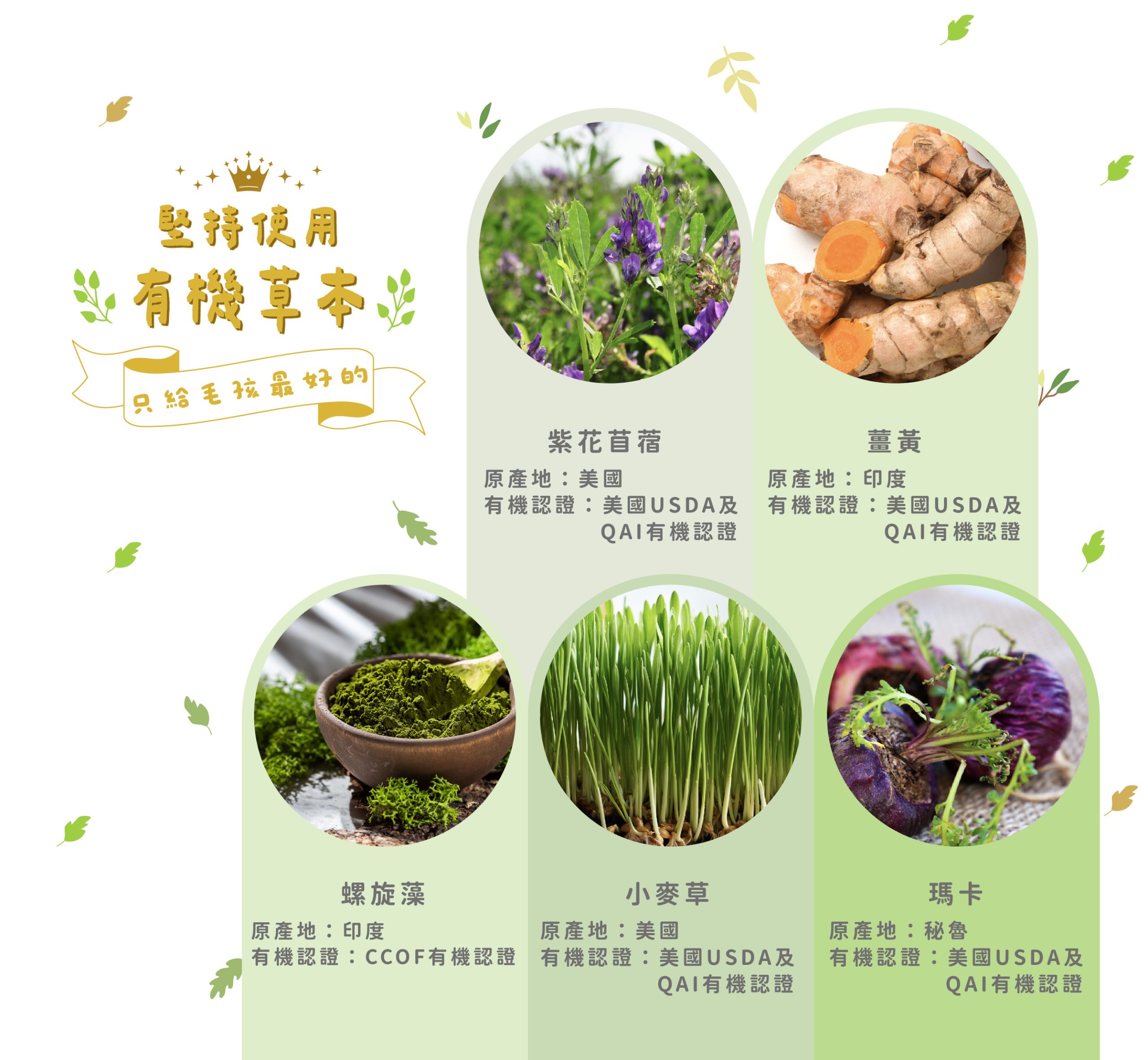選用經美國 USDA 同 QAI 有機認證嘅瑪卡,含豐富營養成分,以滋補強身嘅功效聞名,被譽為「秘魯人蔘 (Peruvian ginseng)」。同時可幫助毛孩舒緩壓力、提升免疫力。