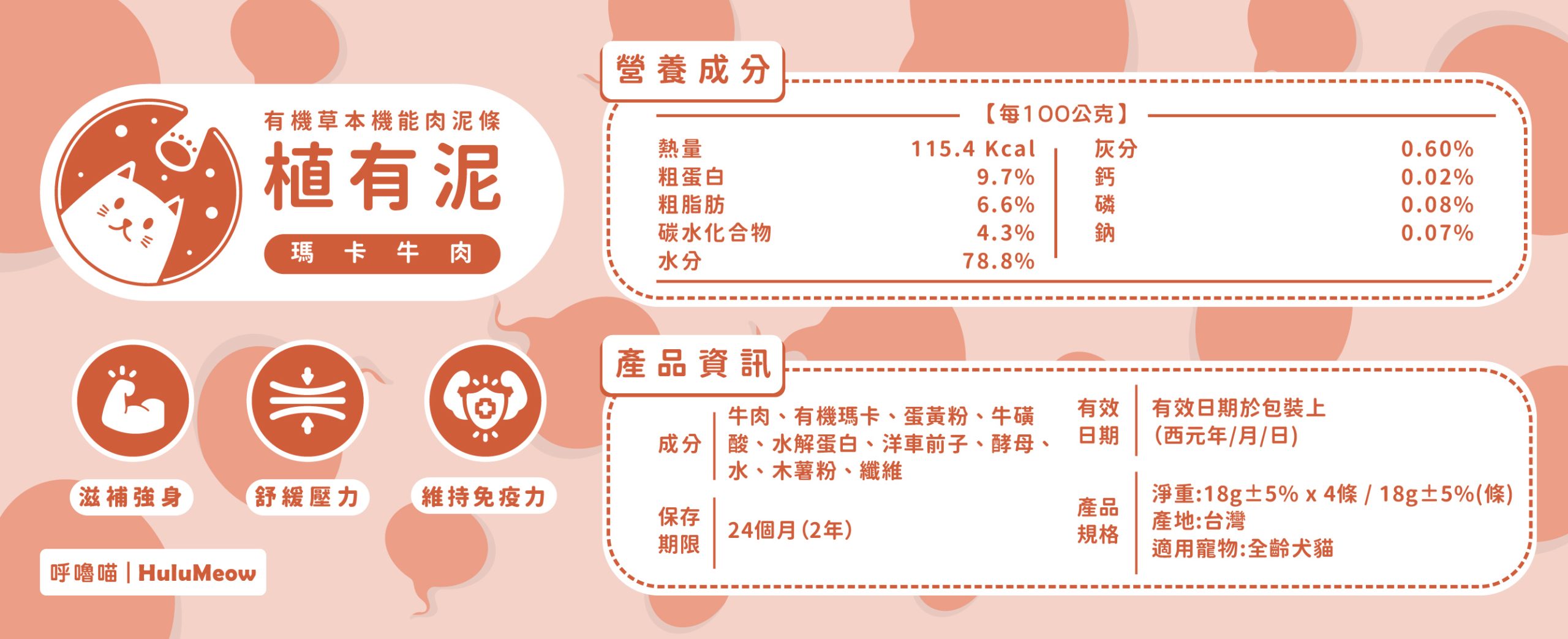 成份:牛肉、有機瑪卡、蛋黃粉、牛磺酸、水解蛋白、洋車前子、酵母、水、木薯粉、纖維
