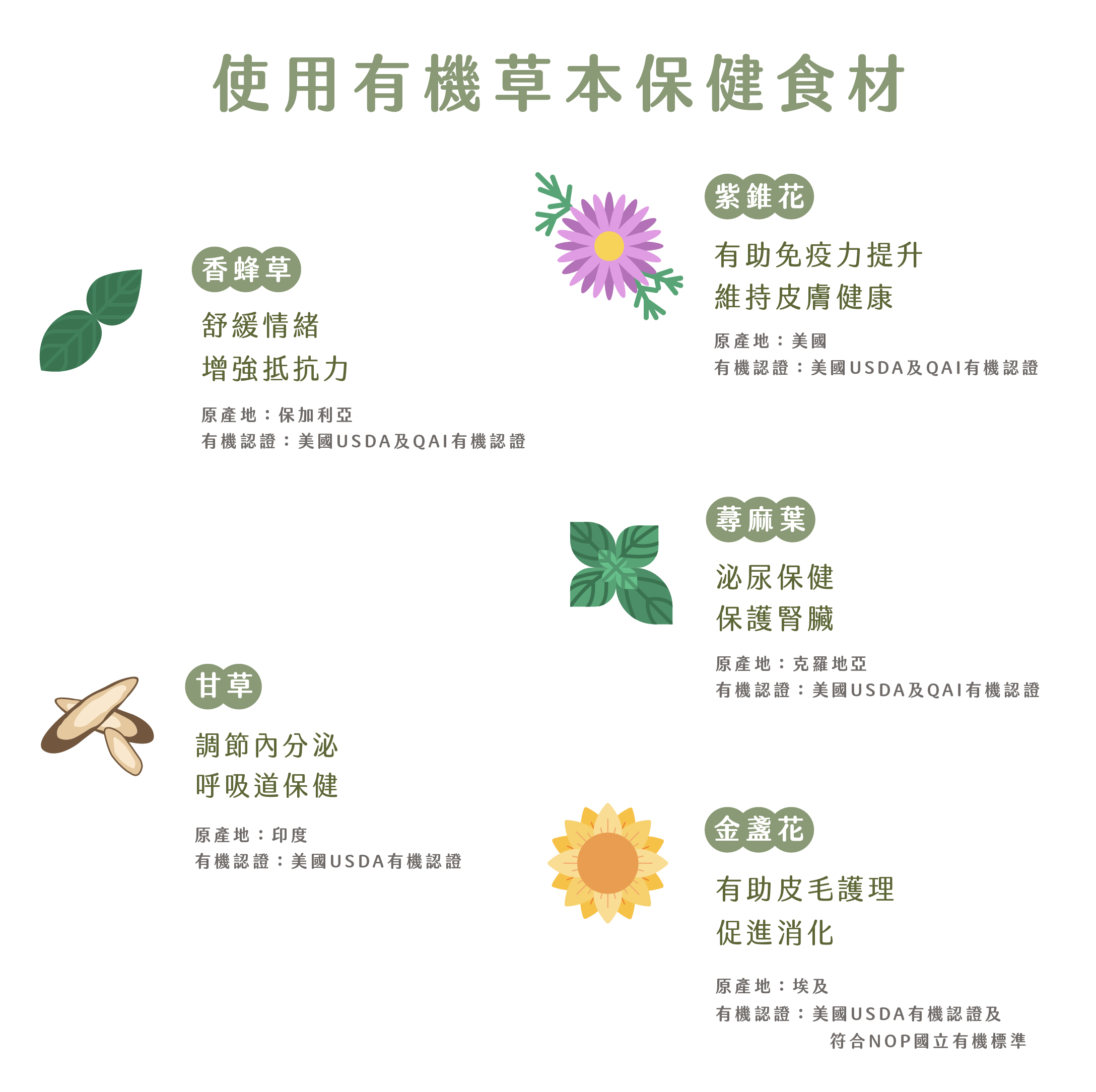 選用來自保加利亞,並擁有美國USDA及QAI有機認證的香蜂草;