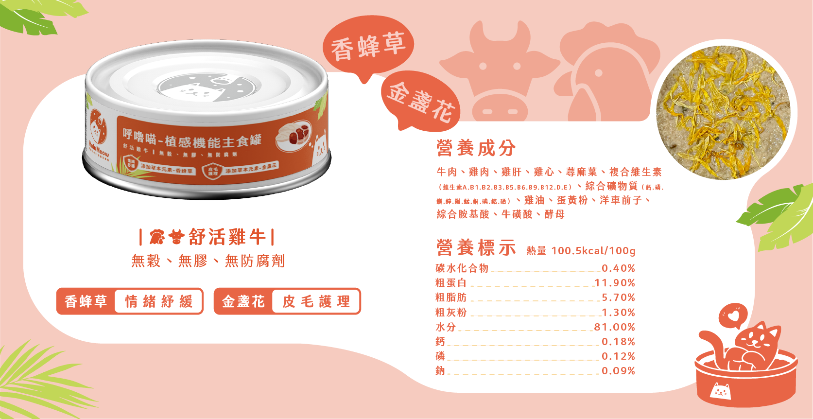 主要成份:牛肉、雞肉、雞肝、雞心、有機細研香蜂草、有機金盞花、複合維生素(維生素A. B1. B2. B3. B9. B12. D. E)、綜合礦物質 (鈣. 磷. 鎂. 鋅. 鐵. 錳. 銅. 碘. 鉻. 硒)、雞油、蛋黃粉、洋車前子、綜合胺基酸、牛磺酸、酵母