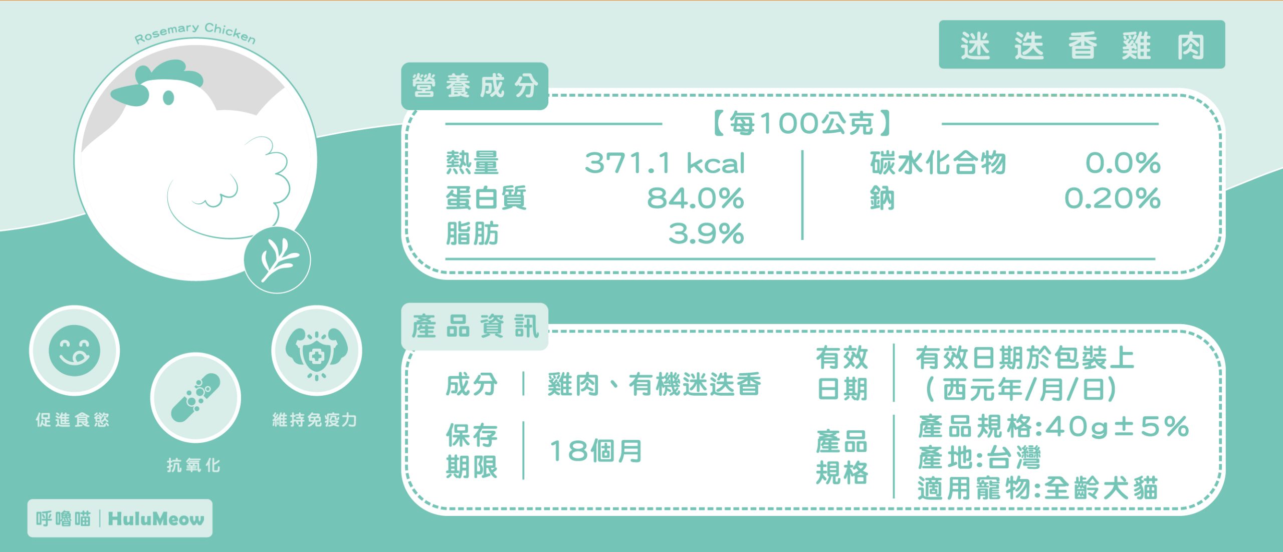 選用經 QAI 認證嘅有機迷迭香,含有豐富天然抗氧化成分,幫助促進食慾,維持免疫力,全方位守護毛孩健康。