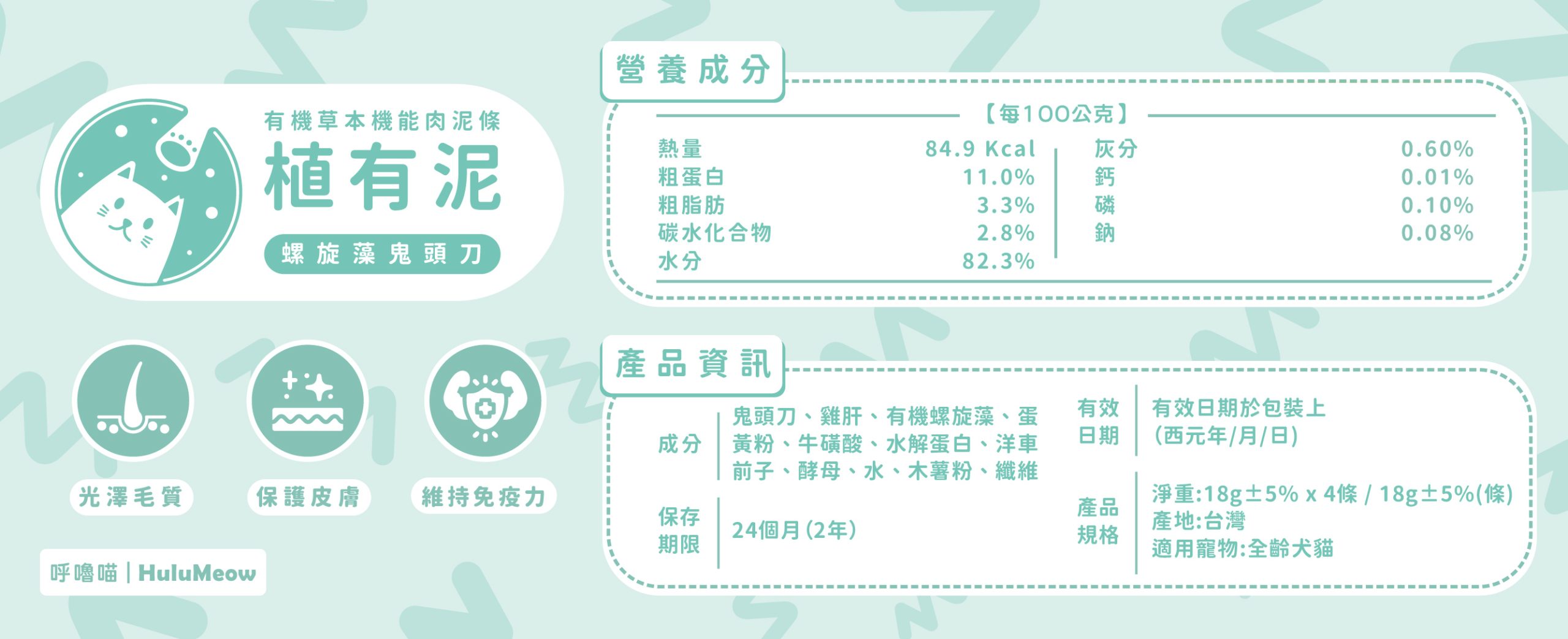 成份:鬼頭刀、雞肝、有機螺旋藻、蛋黃粉、牛磺酸、水解蛋白、洋車前子、酵母、水、木薯粉、纖維