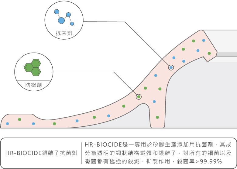 ▍ 矽膠材質韌性好可回彈,並添加「銀離子抗菌劑」,殺菌率高達99.99%,在潮濕的浴室環境下,不易滋生細菌、霉菌。