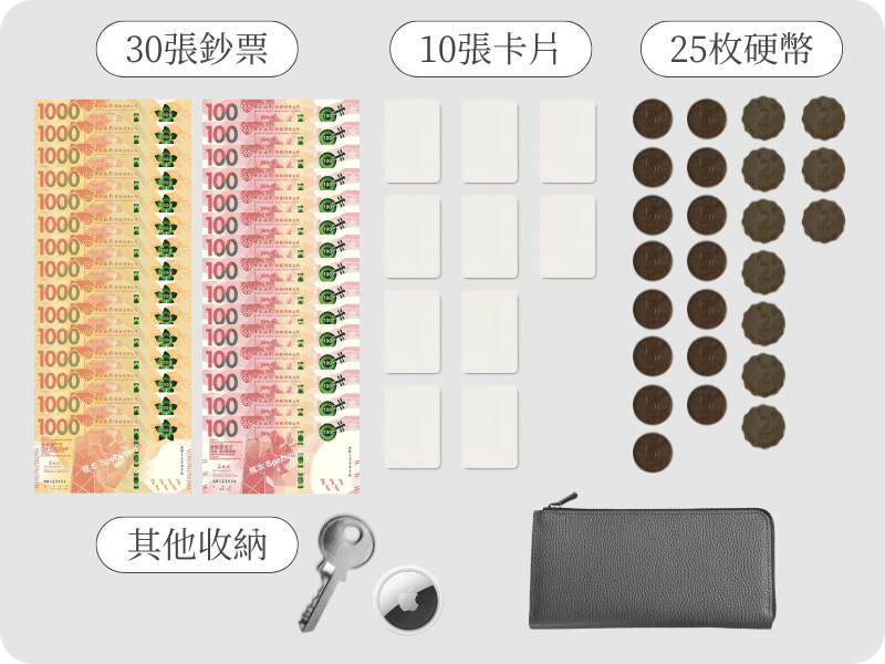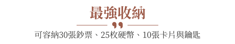 A: 可容納30張鈔票、25枚硬幣、10張卡片、收據和鑰匙。