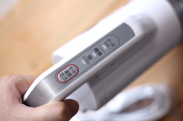 開關設計在把手上面有三段吸力可調整。整台吸塵器只有一顆按鈕,短按為啟動標準 / 弱 / 關閉,長按為強力模式。