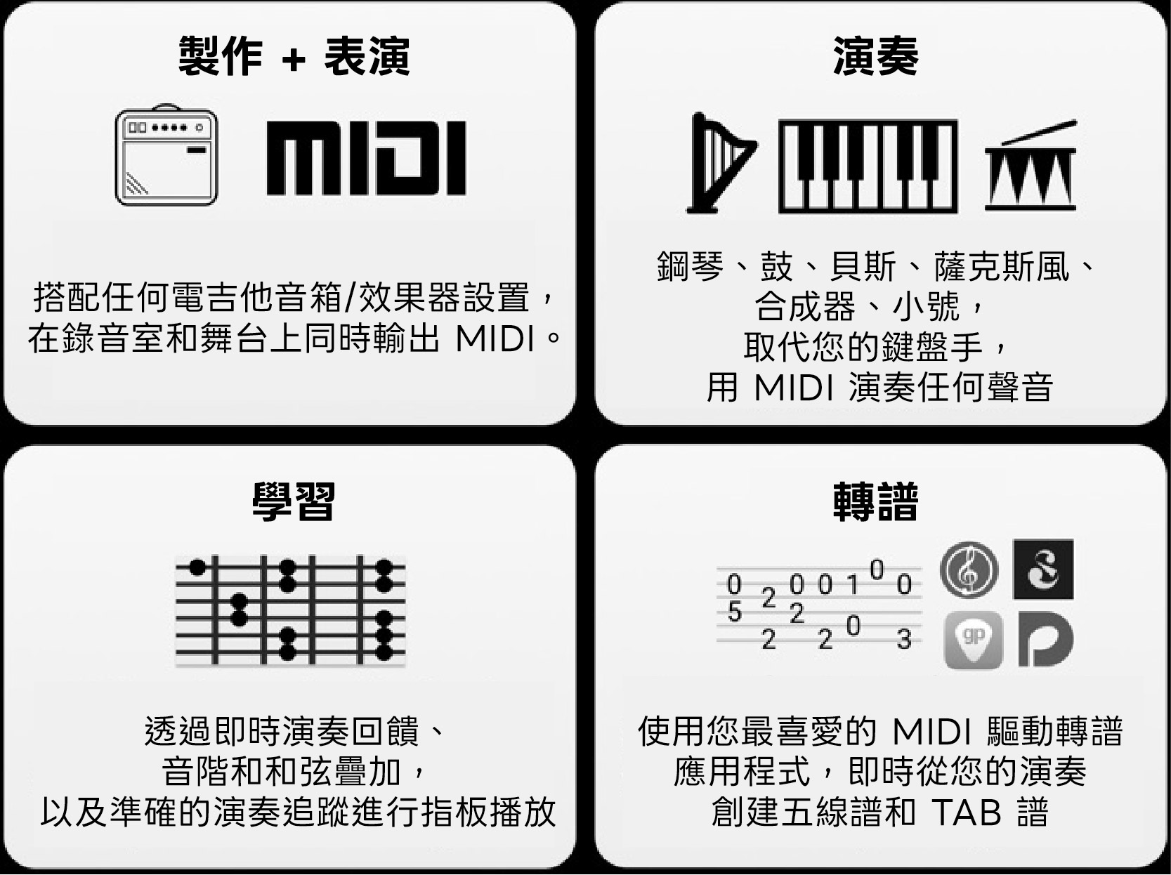 - 透過即時視覺回饋教授和弦形狀、音階與樂理
